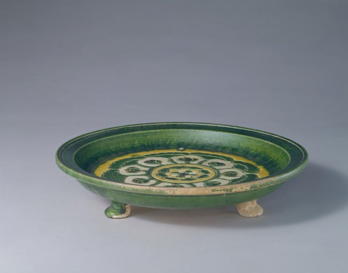This dish has a green glaze all over, with a carved lotus, bud and lotus leaf design in the centre of the dish, applied in yellow, green and white colours. This dish is a fine example of Tang Sancai ware, with its fresh and elegant palette and excellent production.